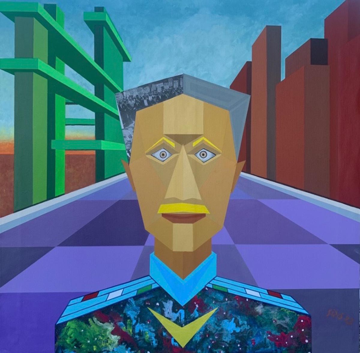 L'opera "Ho un sogno" di questo pittore è un affascinante autoritratto che si manifesta attraverso geometrie sintetiche, giochi di luci e ombre metafisiche e surreali.